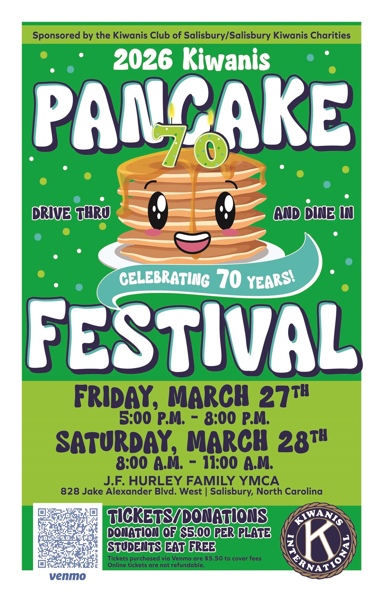 The 70th Annual Kiwanis Pancake Festival will be held on Friday & Saturday, March 27 & 28, 2026, at the J.F. Hurley Family Y.